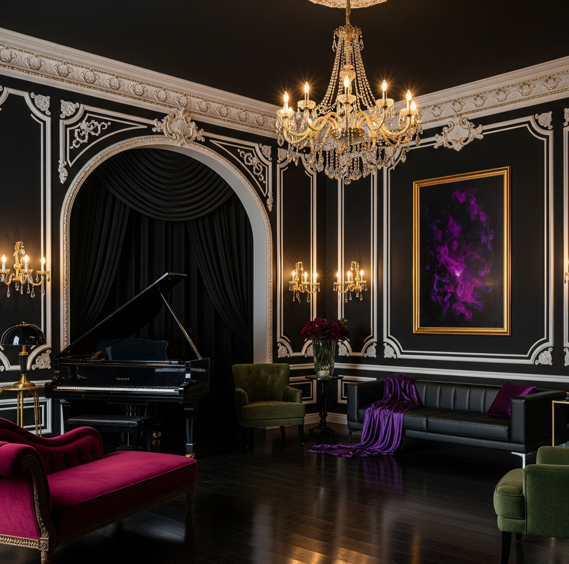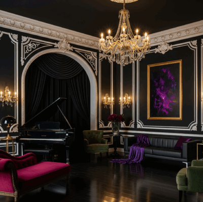 Impossible de parler d’une décoration gothique chic façon Mercredi sans évoquer le noir, véritable fil conducteur. Mais attention : le noir n’est pas monotone, il est multiple. Mat, brillant, velouté ou encore texturé, il crée une richesse visuelle insoupçonnée. Associé à des teintes profondes comme le bordeaux, le vert forêt ou le violet nuit, il compose un intérieur qui ne craint pas l’ombre. Imaginez un mur peint en noir mat, contrasté par des moulures blanches ou dorées : le décor devient une toile théâtrale, dramatique et élégante, à l’image de l’univers Addams.