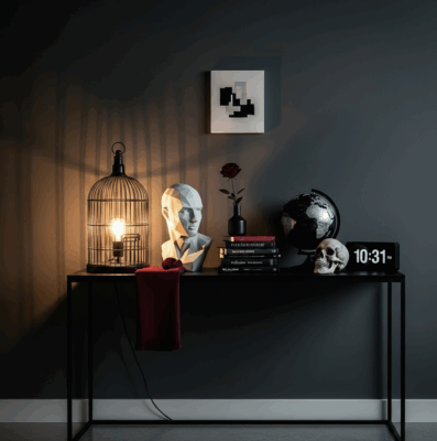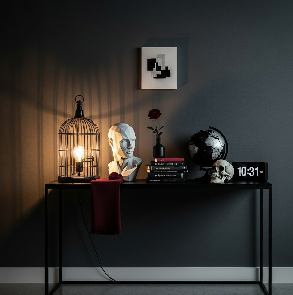 La touche finale réside dans les accessoires. Pas question de surcharger, mais plutôt de choisir des objets qui racontent l’esprit du personnage. Une cage à oiseaux détournée en luminaire, un buste en plâtre posé sur une console, une collection de livres anciens ou encore quelques objets insolites (un globe terrestre patiné, un crâne décoratif, une horloge rétro)… chaque pièce devient un cabinet de curiosités à elle seule. C’est ce mélange entre décor gothique et humour discret qui donne tout son charme à une décoration sombre élégante façon Mercredi : sombre, mais jamais triste.