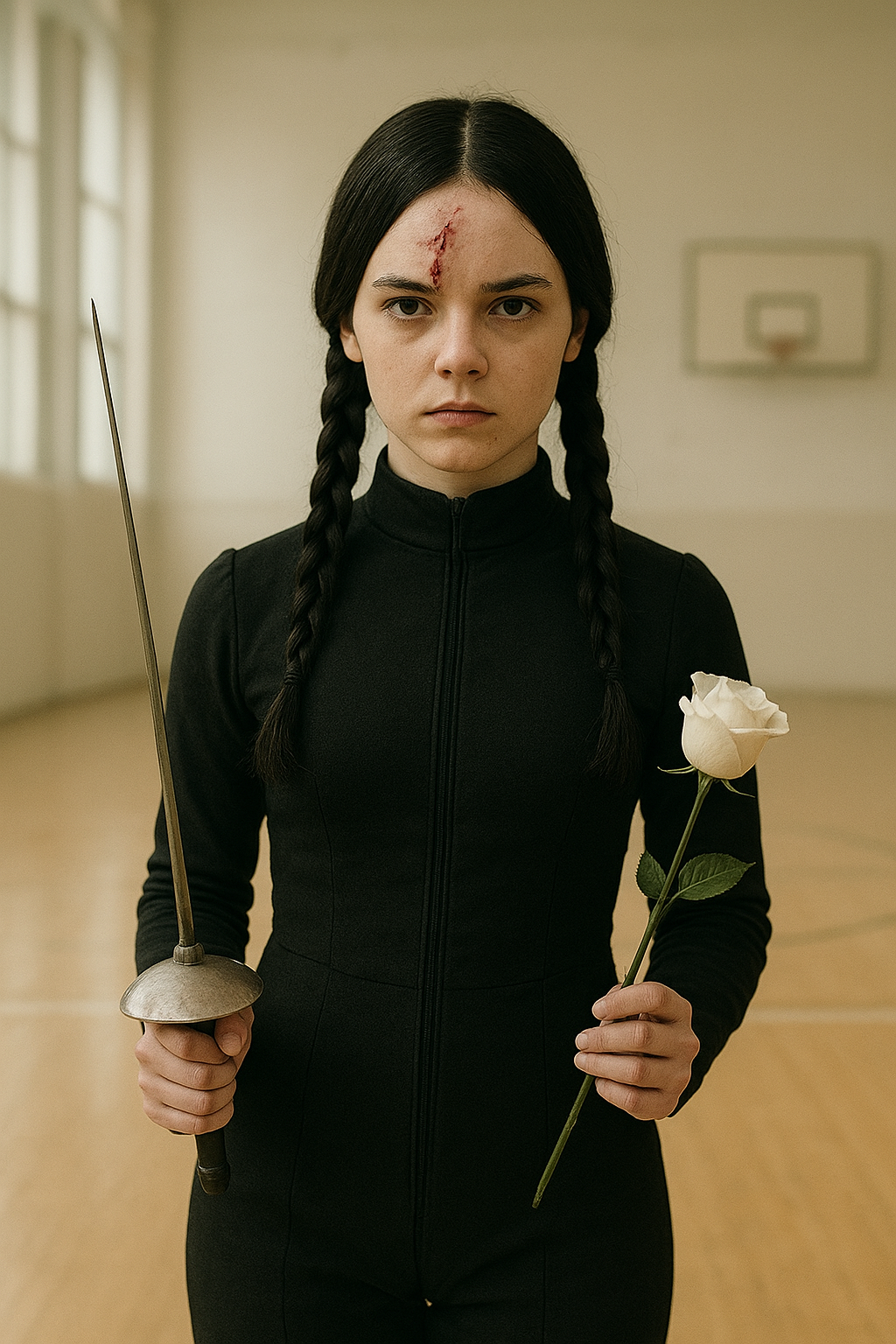 L‘escrime tient une grande place dans l’histoire de la famille Addams. Morticia était déjà capitaine de l’équipe lors de son passage à Nevermore et Mercredi est également une excellente pratiquante. Sa touche personnelle ? La jeune femme aux tresses aime porter une tenue noire qui tranche avec la combinaison blanche admise par tous les athlètes de la discipline. Elle apprécie également les règles plus ancestrales qui ne nécessite ni masque, ni mouche et les combats qui se gagnent par le sang que l’on fait couler.