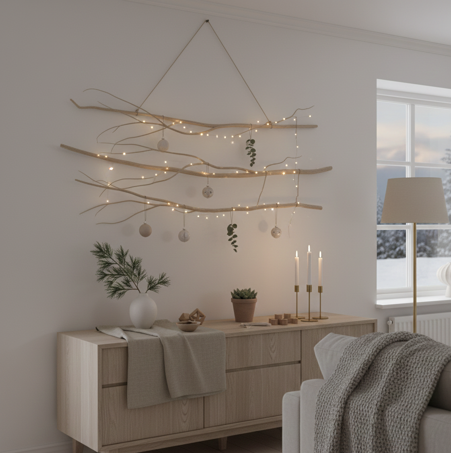 Dans les pays scandinaves, Noël se vit dans la retenue et la lumière douce. Ici, le décor ne cherche pas à impressionner, mais à apaiser. Le sapin traditionnel n’est pas toujours au centre de la pièce. Il se fait parfois discret, remplacé par une silhouette suggérée, quelques branches naturelles ou une composition murale minimaliste.