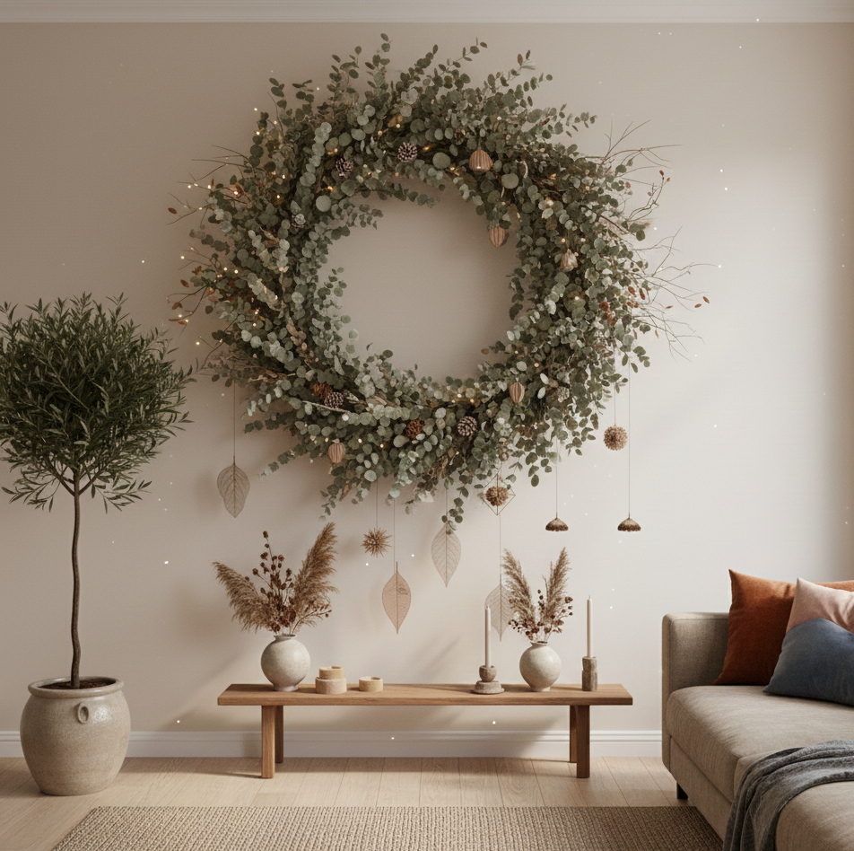 Et si le sapin disparaissait complètement ? Cette idée, encore marginale il y a quelques années, s’impose aujourd’hui comme une évidence décorative. Le végétal prend alors une autre forme : branches d’eucalyptus, feuillages séchés, compositions murales ou suspensions poétiques.