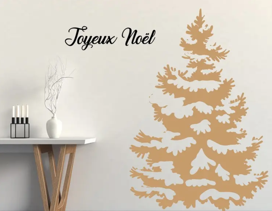 Le sapin devient alors un élément de décor à part entière, presque une œuvre murale. Noir mat, blanc givré, doré subtil ou effet bois, le sticker s’adapte à tous les univers. Il peut être complété par quelques décorations légères, des suspensions ou une guirlande fine pour renforcer l’effet visuel.