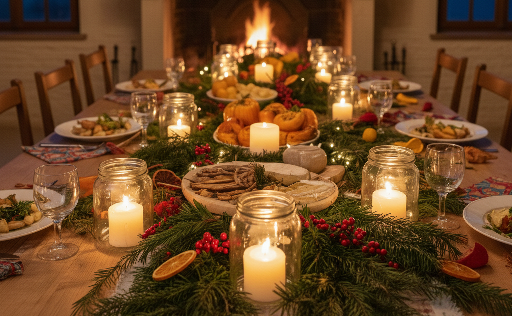 - Une déco zéro déchet faite de branche de sapin, de brins de houx, de tissus de récup’ et de photophores faits maison.